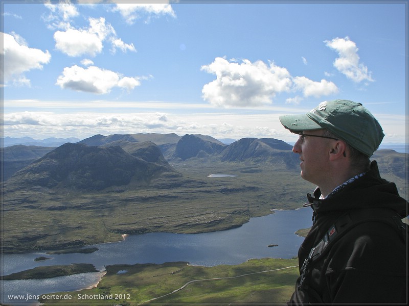 Ob des weiterhin sonnigen Wetter besteigen wir heute den Stac Pollaidh, auch Stac Polly genannt. Der Zustieg ist heute fein kurz, es sind daher einige Leute unterwegs, von 4 Jahren bis ca. 75 J Der Berg selbst ist ein kleines Elbsandsteingebirge und die Kletterei zu den Gipfeln macht echt Spass. Nur den Nordgipfel lasse ich aus weil ein dicker, großer Brocken auf dem Grat liegt. Die Umkletterung desselben ist dann doch nur was für Jens. Aber die Aussicht von hier oben ist heute atemberaubend! Schöner und eindrucksvoller geht es kaum. Leute, mir gehen die Adjektive aus, fahrt einfach hin und schaut es euch selbst an! Irgendwann reißen wir uns los und steigen ab, umrunden die andere Bergseite und laufen zurück zum Auto. Hier müssen wir uns mit dem Einsteigen etwas beeilen weil die Midges heute wieder besonders hungrig sind. Wir fahren auf der Single Track road weiter raus Richtung Summer Isle. Ein Boxenstopp bei Summer Isle Food und wir machen ein Picknick in den Dünen des Auchnahaird Beach. Der mit Torf geräucherte Lachs und noch viel mehr der mit Glen Moray Whisky verfeinerte sollte dringend nach Deutschland exportiert werden! Leckerer geht’s nicht!