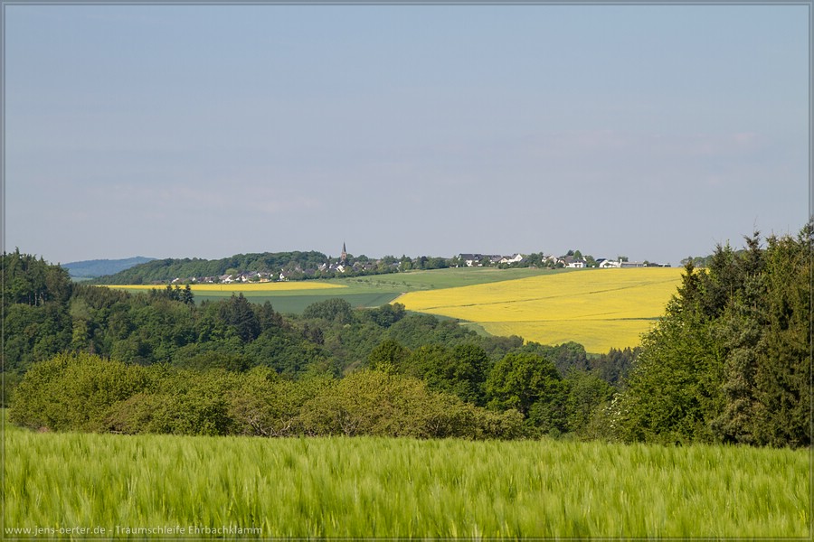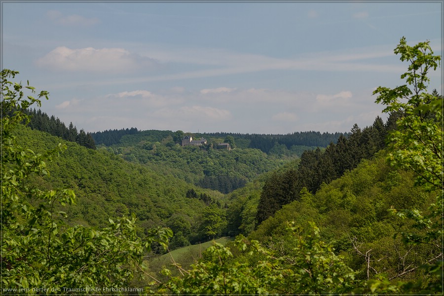 Das ganze Tal ist mit schönen frischen Moos überzogen und an einigen Stellen gibt es kleine Wasserfälle. Kurz vor dem Ende des Tals erreicht man die Daubisberger Mühle. Hier bekommt man kleine Speisen und Getränke. Wir folgen weiter dem Weg der sich unterhalb des Schloss Schöneck langsam den Berg hinauf schlängelt. Auf dem Schloss angekommen lassen wir den Blick zurück ins Ehrbachtal schweifen. Nun verläuft der Weg wieder oberhalb der Schlucht durch Felder, Wiesen und schöne Wälder. Einige Aussichtspunkt wie zur »Ruine Rauschenburg« oder die »Peterslei« einem Felssporn versüßen unseren Pfad. Leider hatten wir und auch einige andere beim ersten Aussichtspunkt zur Ruine einige Wegmakierungsprobleme die wir aber mittels GPS Track umgehen konnten. Hier sollten die Wegebauer Abhilfe schaffen. Weiter geht es über kleine Wald und Feldwege entlang des Winkelholzberg wieder zurück zum Parkplatz in Oppenhausen.