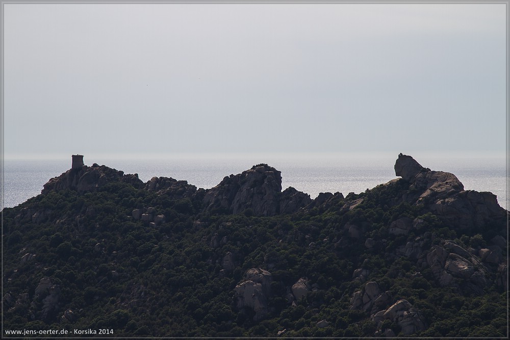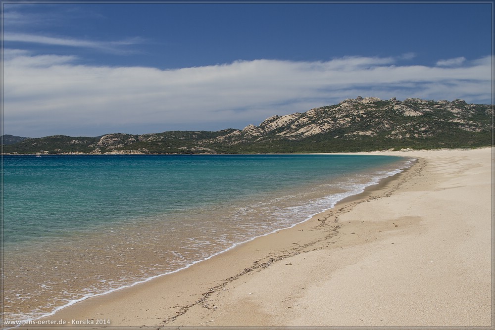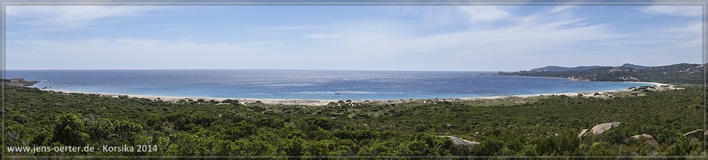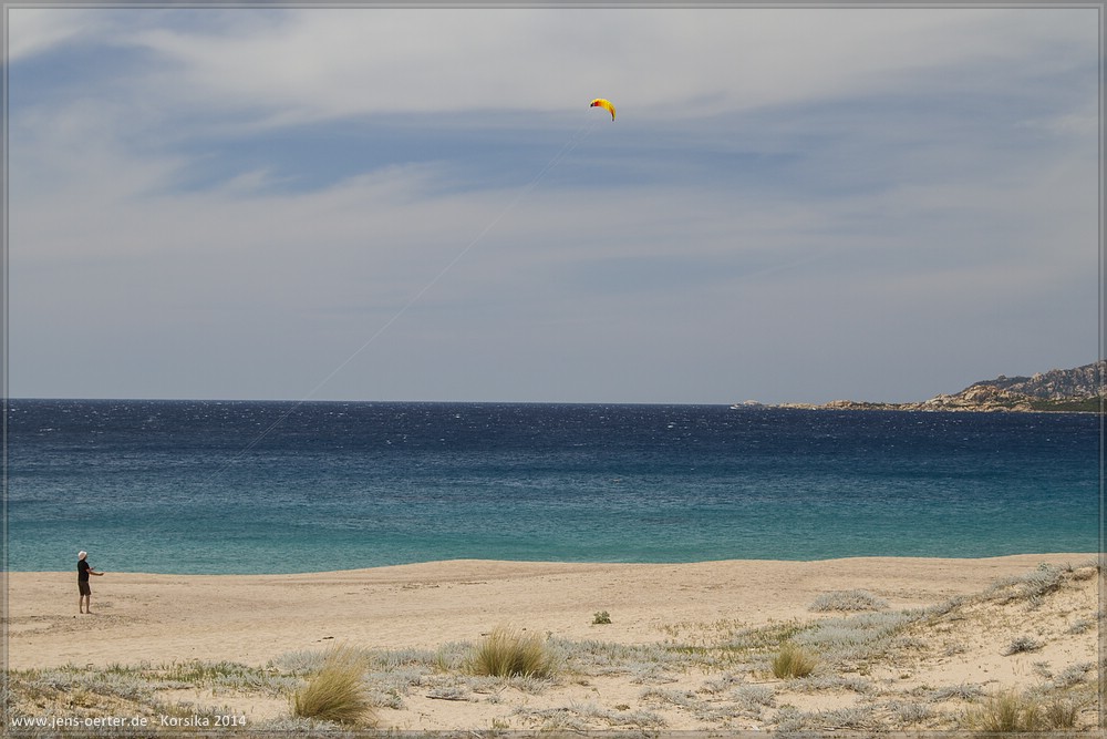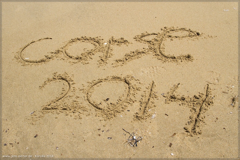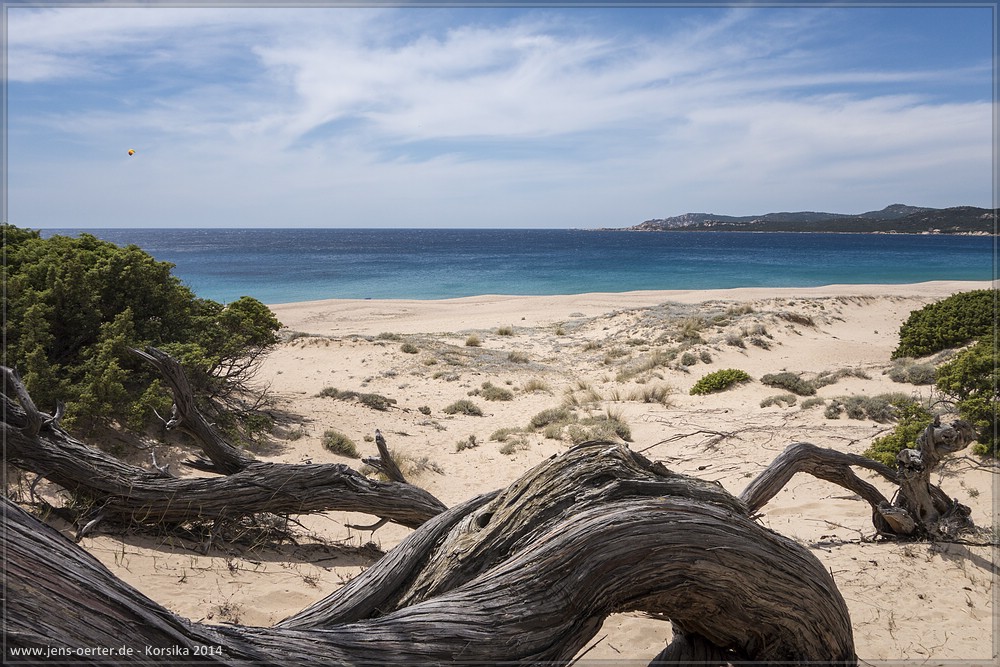 Bevor wir morgen nach Norden in die Berge aufbrechen geht’s heute noch mal an den Strand. Wir haben uns aber für einen etwas abgelegeneren, schönen Sandstrand entschieden, der nur zu Fuß erreichbar ist. Wir fahren von Porto Vecchio zur Westküste. Bei der »Auberge Coralli« ein paar Kilometer hinter »Pianottoli-Caldarello« biegen wir links auf eine derzeit gut befahrbare Piste ab. Man kann auch von dort laufen, was jedoch nicht empfehlenswert, da der Weg recht staubig und langweilig ist. Man fährt bis zum Parkplatz am Ende des Weges. Nun geht es endlich los. Der Pfad führt erst einmal Richtung Sandstrand, dann rechts in die Hecke und steil bergauf bis zum Genueser-Turm. Der erste Strand ist gut besucht, das türkisfarbene Wasser ist aber wirklich sehr verlockend. Vom Turm aus blickt man auf beide Sandstrände, wobei uns Ziel deutlich länger ist und von hier ziemlich unbesucht ausschaut. Vom Turm steigt man wieder ein paar Meter ab und folgt dem Weg weiter auf die andere Seite des Hangs. In Serpentinen schlängelt sich der Weg zum Stand. Hier hat man alle Möglichkeiten sich zu Entfalten. Viele alte Bäume geben genügend Schatten und die Stämme eine gute Sitzgelegenheit. Wie in der Karibik präsentiert sich der Ozean, kaum eine Menschenseele – Herz, was willst Du mehr!